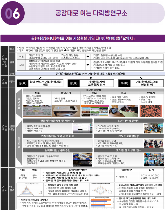 게임리터러시 연구교사 게임리터러시 온라인 연수 게임리터러시 집합연수 교사 자료실 교사 자료실 제목 [2021 신규 교사연구회 사례집] 6. 공감대로 여는 다락방연구소 날짜 2025-02-06 조회수 45 [2021 신규 교사연구회 사례집] 6. 공감대로 여는 다락방연구소 첨부파일 [2021 신규 교사연구회 사례집] 6. 공감대로 여는 다락방연구소.pdf 이전글 [2021 신규 교사연구회 사례집] 5. 게임의 쓸모 다음글 [2021 신규 교사연구회 사례집] 7. 과.현.미 게임 적용 교사연구회 목록으로