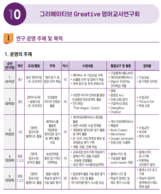 게임리터러시 연구교사 게임리터러시 온라인 연수 게임리터러시 집합연수 교사 자료실 교사 자료실 제목 [2021 기존 교사연구회 사례집] 10. 그레이티브 영어교사연구회 날짜 2025-02-06 조회수 8 [2021 기존 교사연구회 사례집] 10. 그레이티브 영어교사연구회 첨부파일 [2021 기존 교사연구회 사례집] 10. 그레이티브 영어교사연구회.pdf 이전글 [2021 기존 교사연구회 사례집] 9. 교실 게이미피케이션 교사연구회 다음글 [2021 기존 교사연구회 사례집] 11. 놀공늘공 교사연구회 목록으로